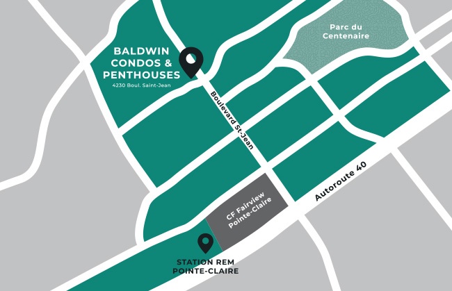 Par exemple, le projet Baldwin Condos & Penthouses est situé à proximité de la future gare du REM, qui reliera le quartier au centre-ville de la métropole en moins de 25 minutes dès 2024. D’ici là, sachez que la gare du train de banlieue Roxboro-Pierrefonds vous permet de rejoindre le centre-ville en seulement 26 minutes. Vous préférez utiliser votre voiture? L’autoroute 40 ainsi que le boulevard Saint-Jean se trouve à proximité du projet.