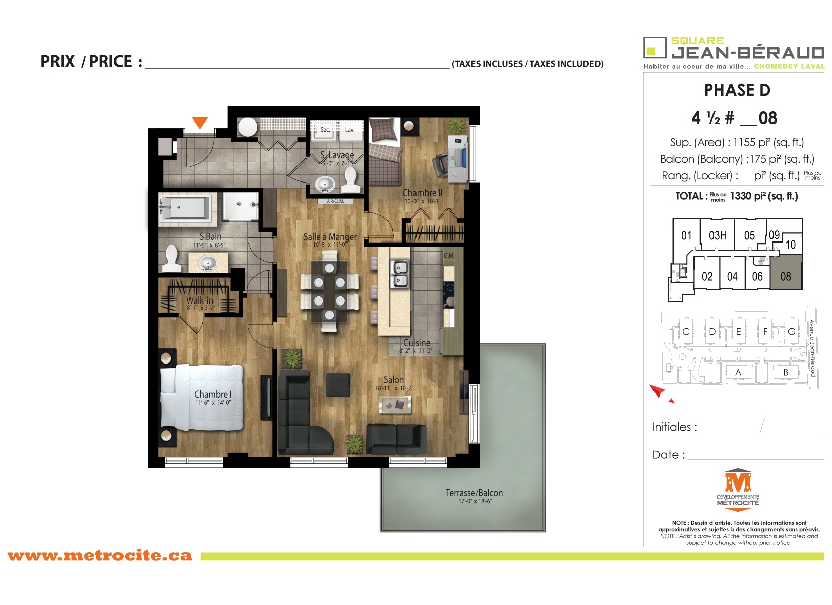 - Superficie total : 1155 pi2